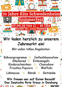 Das Deutsche Rote Kreuz, Kreisverband Duisburg e.V. lädt herzlich zum Sommerfest anlässlich des 70- jährigen Bestehens der Kita Schwedenheim ein.